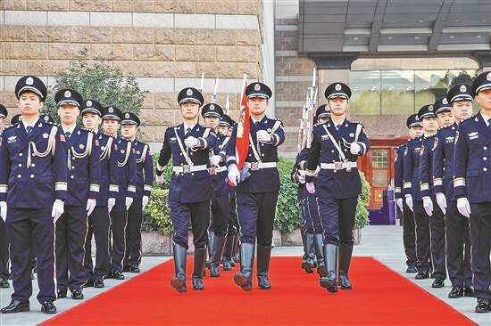上午9时整,升警旗仪式正式开始。仪仗队员身姿如松,步伐坚定有力,护卫着警旗整齐行进至升旗台前。随着激昂的《中国人民警察警歌》响起,那面凝聚着荣誉、承载着责任、昭示着使命的鲜艳警旗,迎着晨风徐徐升起。全场肃然,目光如炬,共同向警旗致以最崇高的敬意。“我是中国人民警察,我宣誓:坚决拥护中国共产党的绝对领导,矢志献身崇高的人民公安事业……”广州市副市长,市公安局党委书记、局长张锐带领全体民警,面向警旗高举右拳庄严宣誓,誓言铮铮。