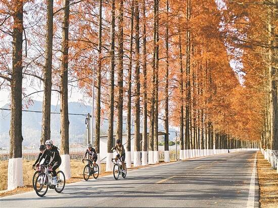 冬日,骑行爱好者们正穿越浙江开化县最美公路——桃下线白渡路段。放眼望去,公路两旁的水杉层林尽染,高耸入云,美不胜收。