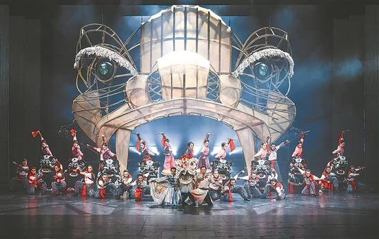 1月10日至11日,由广州歌舞剧院创排的舞剧《醒·狮》在醒狮起源地广东佛山巡演。18名男演员舞起9头威风凛凛的醒狮,站上鼓面向前迈进。霎时,灯光熄灭,舞台上出现了用竹片龙骨架搭建的巨型醒狮造型,它睁开双眼,目光如炬,全场掌声雷动、一片惊呼。
