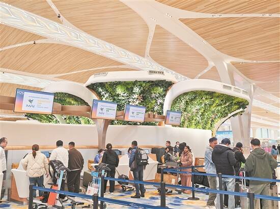 在轨道接驳优化方面,机场主动协调城轨运营方,在航班高峰期加密发车频次。同时,在T3交通中心显示屏持续滚动播放地铁换乘指引,让旅客清晰掌握各类出行信息。