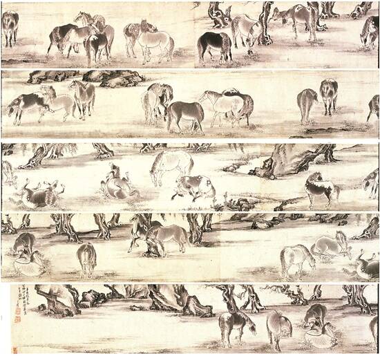 此卷创作于康熙二十一年(1682年),是张穆七十四岁高龄时应“公叔世兄”之请所绘,也是他传世所有马主题作品里,年代最晚、最为成熟的一件珍品。画卷描绘70匹骏马,姿态无一雷同,或奔跑,或翻滚,或嘶鸣,以笔墨生动捕捉骏马在天地间的各种动态。