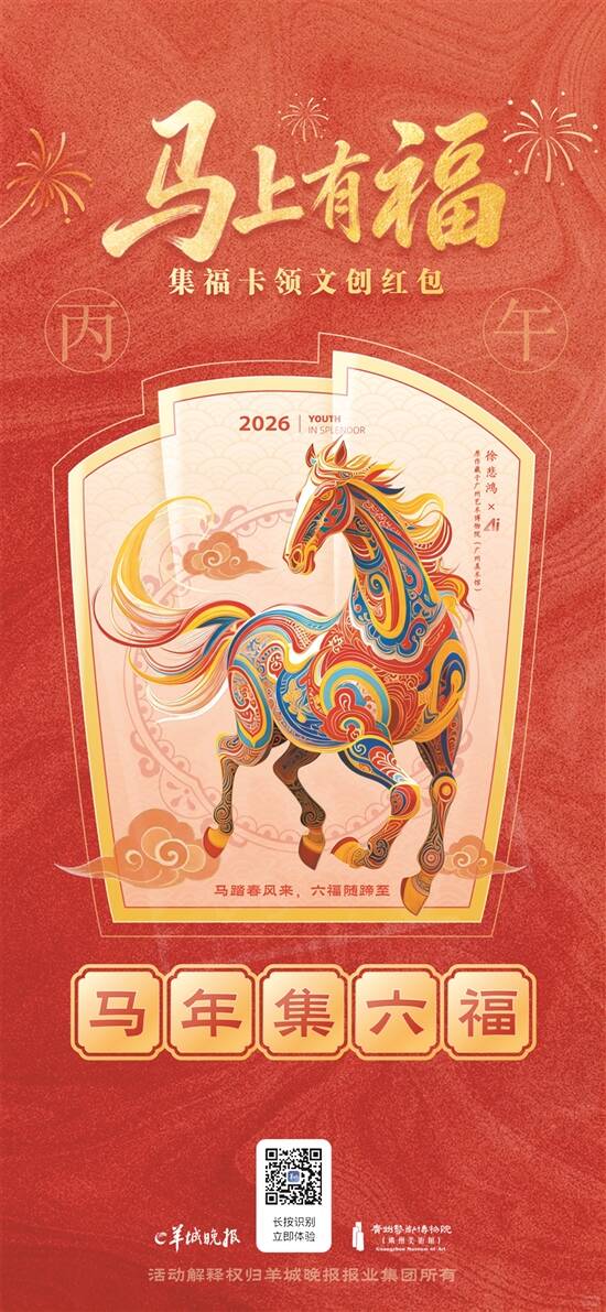 展览启幕之际,羊城晚报报业集团与广州艺术博物院联合推出线上小游戏《“马”上有福》,同步上线羊城派博物馆频道。只要登录羊城派APP,点开博物馆频道,便能看到小游戏界面,点击“立即抽卡”即可开启集福之旅,抽取融入中国传统色彩知识的马年主题福卡。