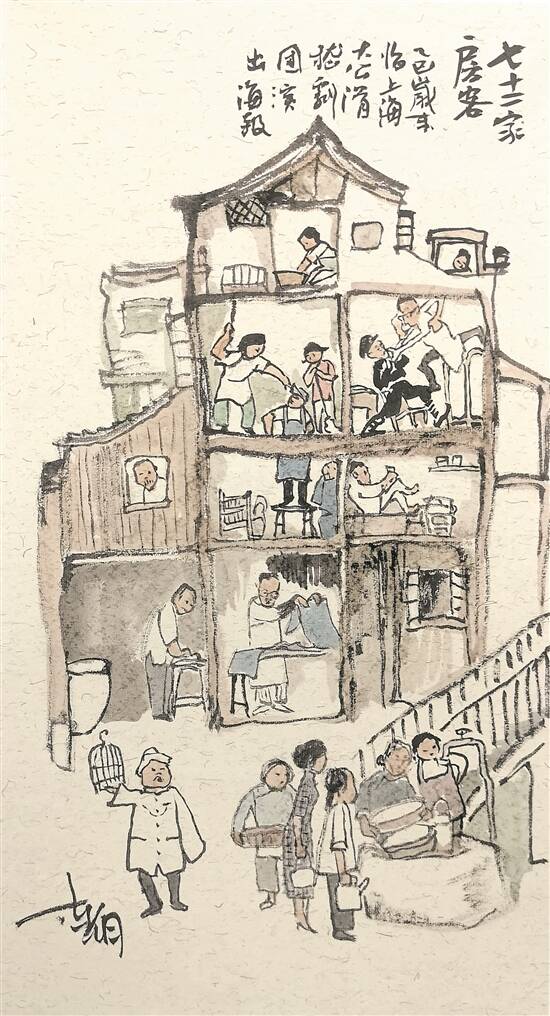 《七十二家房客》原本是上海出产的滑稽剧,表现的也是旧上海底层社会的生活。我收集的一份当年的演出节目单,上面就以漫画的手法画着一个房屋的剖面,各式各样的人物就在橱窗式或鸟笼式的格子里演出他们的日常和遭遇,看上去跟后来同名电影中搭建的场景别无二致。但是,既了解上海又熟悉广州民居建筑格局的人都知道,旧式的广州民居,多半都是骑楼式的,一进门就是一道又长又窄的楼梯,就算很多人能够住在同一栋楼里,也不会有天井式的公共活动空间,要过集体生活,人们便去茶楼,所以广州的茶楼很兴旺,就是得了空间不互通的好处。1963年,《七十二家房客》拍成了以广州为背景的电影,硬生生地搭出了一个西关没有的同一个屋檐下底层人杂居的场景,为了做实故事就是发生在广州,还在大杂院外面弄了点鸡公榄一类的民俗。以后每隔一段时间,《七十二家房客》都会出现新版本,香港重拍过电影,周星驰也痛痛快快挪用了一把,而离我们最近的电视连续剧,广东拍了没多久上海又拍,好像是为了正本清源,让故事重新回到上海。有了这么多搞不清是加料还是减料的版本,我们再说《七十二家房客》,就一定要注明时间、人物和地点,也就是什么时候什么人在什么地方所拍,不然我们谈的虽然是同一个故事,却不会是同一个作品。