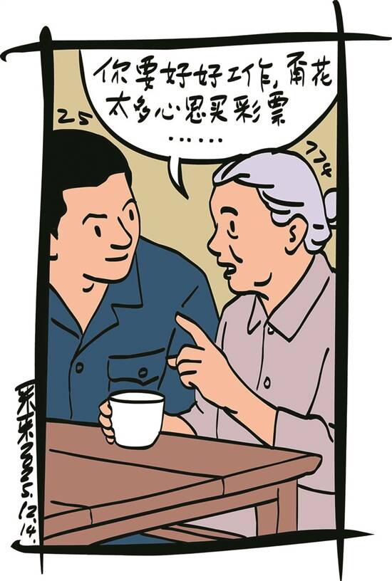 娘总是笑着拍拍他的手,说:“你要好好工作,甭花太多心思买彩票。你出息了,娘就心满意足了!”