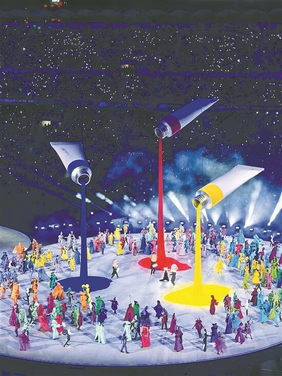 红、黄、蓝三支巨型颜料管出现在开幕式主会场舞台上空,“颜料”源源不断地涌出。同时,身着各种色彩、代表意大利不同文化符号的演员在舞台上尽情舞蹈。这些符号有:古罗马、文艺复兴、美食、时尚、设计、建筑、文学、咖啡、狂欢节……没错,这一切都“很意大利”。