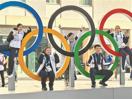 毫无疑问,村里最聚人气的地方是那座巨大的奥林匹克五环标志。它早已成为各国运动员必到的网红打卡点——年轻选手们攀上五环,摆出各种创意造型,欢呼与笑声此起彼伏,竞技的紧绷感在此刻化为跃动的青春。