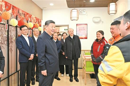 位于西城区北草厂胡同的“吾老·新街”养老服务街区,近年来推进无障碍和适老化改造,为老年人提供多元化养老服务。10日上午,习近平来到这里,走进新街口街道父母食堂,察看菜品、价格和就餐环境,仔细询问食堂开展养老助餐服务情况。见到在这里休息的快递小哥,习近平关切询问他们的工作和生活,为他们付出的辛劳和作出的贡献点赞。他指出,尊老敬老是中华民族传统美德,爱老助老是全社会共同责任。各级党委和政府要统筹各类资源,推动养老服务扩容提质、持续发展,努力为老年人安享幸福晚年创造更好条件。