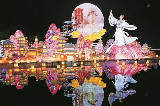 本次灯会总面积约800亩,游览线路长2.5公里,设置五大主题展区,包括“星河驰骋・骏马腾云”“绿野仙踪·生态和鸣”“逍遥天地·数智未来”“千年一梦·烟火人间”及“同根同源·湾区和韵”,展出上百组大型灯景。