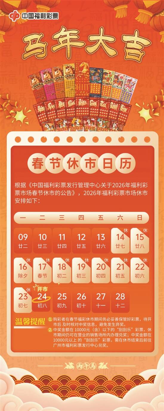 根据《财政部关于2026年彩票市场休市安排的公告》《中国福利彩票发行管理中心关于2026年福利彩票市场春节休市的公告》,广州福彩从2月14日(腊月二十七)0:00起休市10天,2月24日(正月初八)0:00起恢复正常销售、开奖和兑奖。