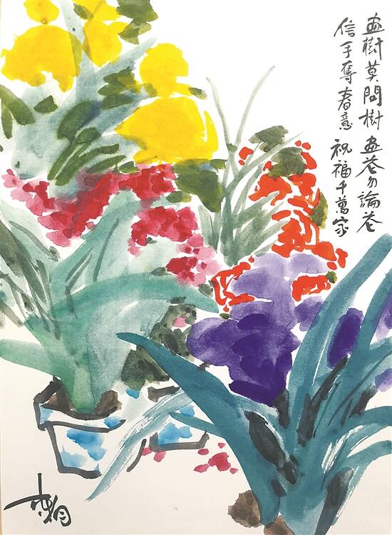 此刻,广东各地最显繁忙的就是那些在步行街上临时搭建的花市,人们无论多忙都要在春节来临前逛一次花市,再舍不得花钱也要搬一盆金桔回家,这种以花为题的年货采购成了广东人过年的标配,也只有在花市上才能闻到特别的“年味”。所以,有感于此或受托于人的画家,常常会用风俗画的形式去表现这个盛大热闹的场面,但怎样才能画得既不像新闻照片,又不像张择端的《清明上河图》,倒是要费一番心思,或许还得背负起反映时代精神的使命。花市作为年末仅次于车站机场的人口大集结场所,定然是像镜子一样,把各式各样人的精神面貌,连同花的寓意都映照了出来,是花,是人,更是一个时代,所谓扑面而来的春意大概指的就是花市里里外外的整个景象吧。