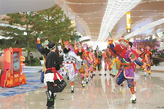 2月15日,大年廿八,早上9时许,广州白云国际机场T3航站楼候机大厅内,一阵阵铿锵有力的英歌鼓点骤然响起,让行色匆匆的返乡人群纷纷停下脚步围观。