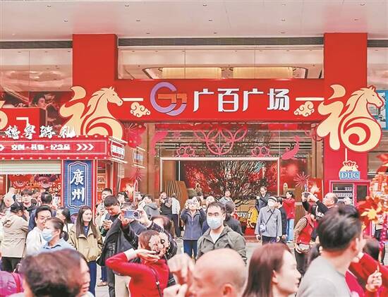 除了动感十足的表演,各大商场还精心准备了沉浸式的年俗体验。市民李女士今天一大早就带着孩子来到了广州友谊环市东店,在“霓裳剪影·马跃新程”巨型主题艺术装置前拍照打卡后,又带孩子参加了“翰墨迎春·粤韵送福”活动。“让孩子听听地道的粤语讲古,了解一下广府年俗,这样的春节特别有意义。”她笑着说。
