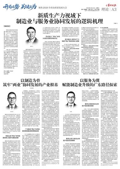 三、提升全流程效能。服务业赋能制造业转型升级,涉及技术研发、产品设计、品牌塑造、市场拓展、营销服务等全链条环节。从广东实践来看,全省多地已在不同环节取得显著成效。广州围绕人工智能与数字经济、商贸物流、科技金融等领域重点布局,深圳建设全球重要的科技创新和人力资源服务基地,佛山着力建设具有国际影响力的工业设计高地,东莞围绕制造业集群发展打造具备区域辐射力的服务平台,惠州深耕智能网联、新型储能等领域。但从全产业链视角审视,以生产性服务业为主体的赋能体系仍存在效能不均、整体水平有待提高等问题,全流程协同赋能效应尚未充分释放。未来,广东要加快构建覆盖研发、生产、流通等全链条的赋能体系,全面提升“两业”协同发展质效。