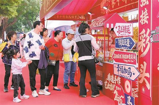 在十三行印迹园旁,一个红色的互动装置区格外显眼。蒙牛新春民俗馆是本次嘉年华的互动核心区,市民游客可凭福卡畅玩全场。拍照打卡、购买产品、体验拼图、投掷福气、滑雪机体验……市民游客逐一体验多个游戏互动区,集满5个印章,可参与100%中奖的抽奖。此外,能沉浸式观看非遗糖画、彩绘、变脸喷火等年俗技艺。