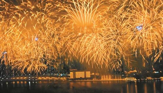 2月17日大年初一晚,广州白鹅潭燃放烟花活动如期举行。万炬烟火同时冲上碧空,一起绽放为巨大的金花,璀璨夺目。