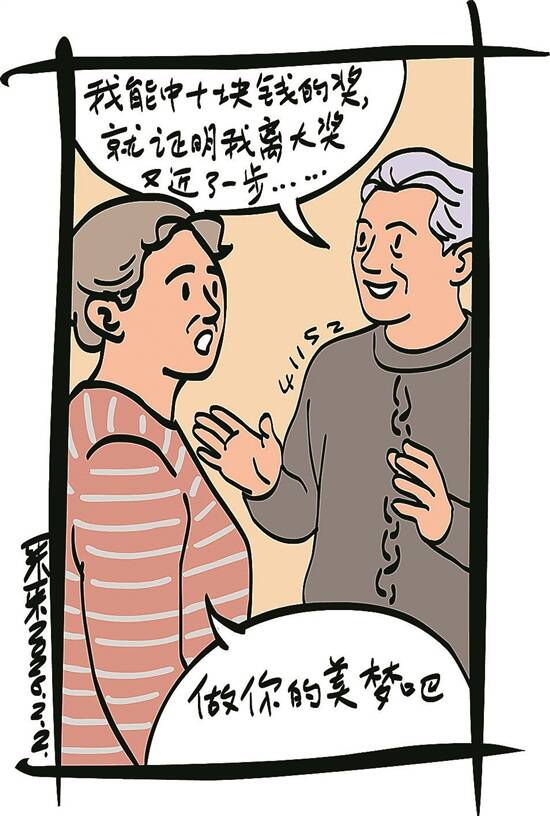 一次,大哥中了五等奖,回家就给大嫂报喜。大嫂不屑一顾地说:“10块钱的奖也值得高兴呀。”大哥说:“咋不高兴呢,好多人连10块钱都没中,我能中10块钱的奖,就证明我离大奖又近了一步。”大嫂嘴一撇说:“做你的美梦吧。”大哥说:“我正朝着美梦迈进呢。”