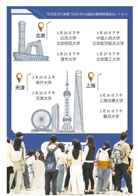 羊城晚报讯 记者周聪报道:春潮漫过南粤大地,每一缕清风都藏着广东求贤若渴的热忱。刚落幕的“百万英才汇南粤”2026年春季大型综合招聘会余温未散,广东再放大招——2026年N城联动春季招聘活动即将启动。首场活动将于3月20日在北京大学举办。