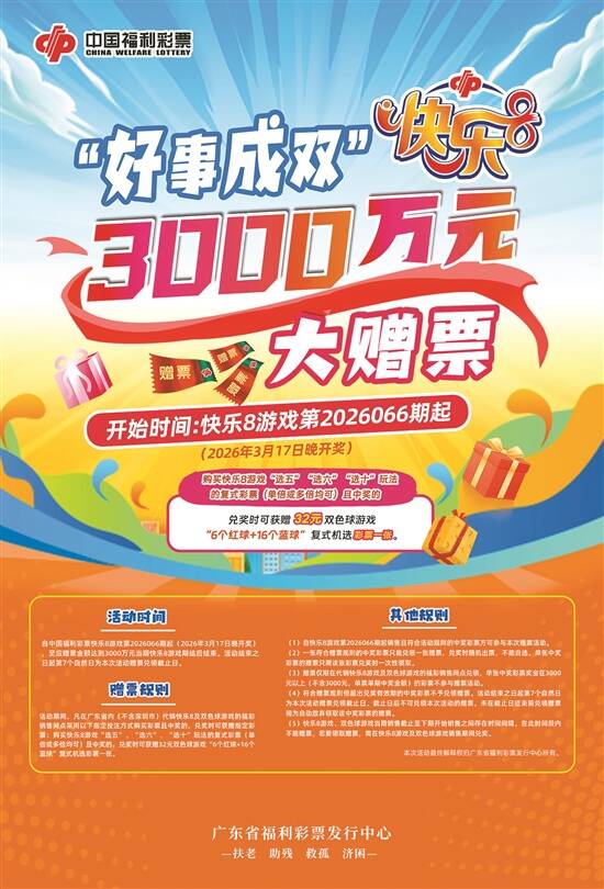 本次活动共安排3000万元赠票资金,自中国福利彩票快乐8游戏第2026066期(3月17日晚开奖)起,至应赠票金额达到3000万元当期快乐8游戏期结后结束。活动结束之日起第七个自然日为本次活动赠票兑领截止日。