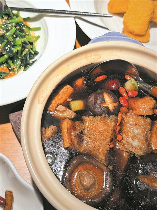 菌类在这里像粤菜中的“鸡”,是素菜的门面。放眼不同的素食店,招牌菜肯定以菌类打头。羊肚菌、舞茸、竹荪、香菇适合提鲜,用来炖汤最佳;杏鲍菇、口蘑、白玉菇最有肉感,因此油煎最香;或加入莴笋、坚果、辣椒爆炒,大火逼出菌香,直至汁水四溢。你只管放心点,剩下的就交给食材本身。