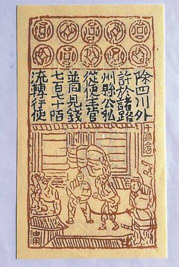 由于是私下的民间行为,后来就由于不能兑现而屡生纠纷。几经曲折之后,于天圣元年(1023),政府权力介入,在四川设置交子务,像铜铁钱一样,禁止民间私造交子,改由政府印制发行。交子的面额,最初从1贯到10贯不等,后来逐渐定型为1贯和500文。发行有定额,以铁钱作为现金准备。并且以两整年为一界,随界以旧换新。具有近代意义的纸币从此诞生,随之应运而生的,还有发行纸币的银行——交子务。
