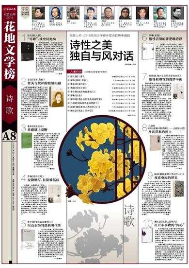 入围作品 (以作者姓名拼音首字母排序) 1 陈先发《九章》安徽教育出版社2017年10月 2 蓝蓝《唱吧,悲伤》 江苏凤凰出版社2017年1月 3 雷平阳《送流水》长江文艺出版社2017年10月 4 李南《妥协之歌》中国青年出版社2017年10月 5 李少君《我是有背景的人》武汉大学出版社2017年12月 6 梁平《家谱》四川文艺出版社2017年10月 7 梁晓明《用小号把冬天全身吹亮》中国青年出版社2017年10月 8 吕德安《两块颜色不同的泥土》长江文艺出版社2017年11月 9 臧棣《最简单的人类动作入门》广西人民出版社2017年12月 10 张执浩《高原上的野花》江苏凤凰文艺出版社2017年12月 1 陈先发《九章》: “写碑”,或史诗抱负 陈先发的诗歌,恰如他自己所说,是“写碑”,简洁而又深刻,留白也很多,意味深长。这正体现了陈先发对本土性美学的追求。他的语言融合了古典诗歌的凝练和现代语言的灵活,超越了不中不西的翻译体,真正形成了个人特色和美学方式,形成了一种强力的风格。 在《九章》中,陈先发不只对一首诗要求完美,他开始追求整个结构的完整,体现了一种史诗意识或史诗抱负。这史诗既是他自身的一种心灵史和精神史,同时也包含着社会史。这个结构富有开放性,是把社会各方面,天地万物、社会经济、众生百态都整体涵盖其中的一个体系。在这方面,陈先发达到了一个典范性的创作状态。 ——蓝海 2 蓝蓝《唱吧,悲伤》 赞美与批评的激情相融 这部诗集是集诗人蓝蓝三十余年诗歌创作的精选,展现了她虔敬为诗歌工作的沉潜实力。她持续不断的诗歌写作,给予日常生活和社会现实以深情的关注,赋予卑微的生命以尊严。多年来,她致力于将赞美和批评的激情融为一体,并将其带入当代抒情诗创作的文本探索之中。她对现实和自然事物的贴近,贯穿了关怀、疼痛和爱,也显示了一种温暖而敏锐的诗性之美。 与此同时,蓝蓝在诗艺上不断超越自身,超越一切门户之见,展现了极强的综合能力和自我更新能力。在当代诗歌的叙述性语境中,蓝蓝在感受力、修辞、文体、表达方式上的独特贡献,构成了当代诗歌写作的一个重要现象。 ——黄礼孩 3 雷平阳《送流水》 重建纸上荒野 雷平阳是这个时代不多见的一意孤行的写作者。这是一个着黑衣的招魂师。他是这个时代最擅长写作笔记体和寓言的人。目击道存,倘恍幻象。雷平阳是一个始终及物、在场的目击者,也是语言秘密的效忠者。这种写作方式完全是一个人与语言、生存和时代不断搏杀的结果。他有着为世界立法的执念、为历史写挽歌的求真意志,以及为灵魂作传的精神词源。在这个漶散莫名的时代,他一直在重建一个纸上荒野。 能够旷日持久地坚持精神难度和写作难度的诗人实属罕见,而雷平阳则是这一极少数中的代表。 ——霍俊明 4 李南《妥协之歌》 安静地写,长期被低估 李南是个长期被低估了的诗人,这与她的低调有关系,也与她题材的“小”和诗作多为短制有一定关联。她的写作沉潜、谦卑、洁净。她一以贯之,拒绝参加任何诗歌运动,总是十分安静地写,不声不响。 她的诗往往每首几行,有的十几行。从细小具体的角度进入,呈现一个个瞬间,在日常的“我”与精神的“我”相互辩驳中缓缓展开,诗句结实饱满,语言晶莹透亮,具有罕见的质地与精神重量。她的诗,用她的话来概括最适合:“那些真正的诗人,像一群弹尽粮绝的戍边战士,在被人遗忘的角落,捍卫着人类的最后尊严。” ——杨克 5 李少君《我是有背景的人》 以山水为背景的现代性 以山水为背景,观万物以深情,于自然之间自如地捕捉诗的灵感,寄寓胸中的情思,建构意义的场域,李少君的诗歌由此找到了中国新诗巧妙接续中华美学传统的精神通道。 他那朴素简洁的诗语道白,有着不可多得的魏晋风度和山水田园诗采,并融入了现代海洋气息,满蕴着情的涓流与爱的衷曲,悄然弹拨读者的心弦。与此同时,借助对当下历史语境的深刻领悟和对现代世态人情的精准把握,李少君的诗歌也生动描摹了当下中国的自然与社会情状,折射着当代人的精神面影和内心生活,从而体现出鲜明现代性来。 ——张德明 6 梁平《家谱》 悟性言情的非逻辑诗路 《家谱》不去关注绝对、抽象之“在”,而以“心灵总态度”在日常生活与情趣的“及物”选择中,建构自己的形象美学,既“走心”,更以识见和经验见长,许多文本不时逸出生活、情绪以及感觉的层面,成为饱含理意内涵、情理浑然的思想顿悟。可贵的是它常在意象、事态的流转中自觉地渗透“思”,走了一条悟性言情的非逻辑的诗之路线,将感性化和理意化双双推上了相对理想的高度;并且深刻烙印着个人化的创新痕迹,形成了幽默从容、举重若轻的机智风格。《家谱》在“写什么”和“怎么写”两方面,均有建树和启示。 ——罗振亚 7 梁晓明《用小号把冬天全身吹亮》 感性和理性的微妙平衡 梁晓明既是60后诗人中的佼佼者,也是一直奔走在中国先锋诗歌前沿的重要代表。作为祖籍安徽、生于上海、三岁随父母移居浙江的江南人,他的诗歌并没有一般印象中江南诗人的缱绻柔情和精致委婉。晓明用他的诗构建了一座独一无二的金字塔,一个集他的思想、世界观、想象力和生命感悟为一身的诗学坐标。 他的诗仿佛浓缩了北方与南方,严格说是超越地域概念的。他的诗歌语言,密度和广度兼顾,阔达中凸显犀利,狂放中又