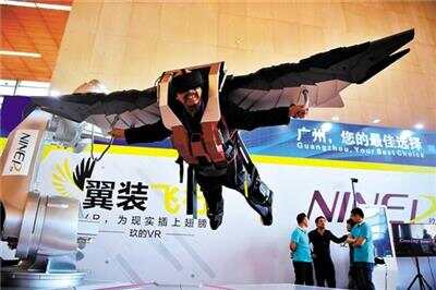 昨天,在广州科技创新成果展上,VR翼装飞行项目吸引了现场嘉宾亲身体验