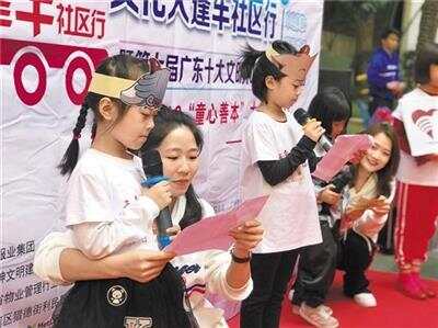 文化大篷车社区行继续前行。从2012年第一届开始,大篷车已顺利开进上百个社区,聚焦社区热点,服务众多街坊。大篷车所到之处,散播了一路的温暖与爱心。 2018“共建共享·和谐广东”文化大篷车社区行暨第七届广东十大文明和谐社区示范活动,由羊城晚报报业集团发起,由广东省精神文明建设委员会办公室、广东省文化和旅游厅、共青团广东省委员会、广东省妇女联合会、广州市民政局、广州市社会组织联合会共同指导,广东省物业管理行业协会、广州市社会工作协会、广州市义务工作者联合会、广州市羊城公益文化传播中心联合主办,并得到天天洗衣、九元航空、大都会人寿广东分公司、广东石湾酒厂集团有限公司的公益支持。 活动现场 A “慈善读本进社区”头炮打响 11月24日,文化大篷车社区行之慈善读本进社区首场活动于猎德街进行,天銮广场组织小小义工队来到中海花城湾社区,为居民带去“童心善本·大爱社区”慈善情景剧表演,为居民朗读公益慈善故事,传播慈善知识,共同体验公益慈善义卖活动,营造慈善、和谐、友好的社区氛围。 “那位中年男子就是历史上大名鼎鼎的范蠡。他曾帮助越王勾践灭吴兴越,功成名就后弃官从商。他经商三次,每一次都成为巨富,然而他三次都将全部钱财分给贫困百姓……”只见台上几名小义工用稚嫩的嗓音演绎着《童心善本系列丛书》第一册《善言善语传承爱》,生动再现羊城善人乐善好施的历史故事,台下的社区居民听得津津有味。看完情景剧,不少居民就从摊位上购买了《童心善本系列丛书》,并将购书金额捐助到广州市慈善会“慈善读本”专项基金。 扮演读本中慈善吉祥物珠珠的邓茵瑜今年六年级,为了准备这次慈善情景剧,寄宿在校的她利用每个在家的周末加紧练习。“比较多的生字,要勤加练习才能流畅表演。”邓茵瑜告诉记者,以前自己不知道原来广州有那么多慈善家,从慈善读本学到了很多美丽的故事,回学校都有和同学分享。“慈善在我的理解里就是去帮助很多人,我觉得做慈善能让我快乐。” “这个活动开始宣传的时候,物业把读本派给我们看,我看了读本之后觉得既有趣又有教育意义,所以就帮助孩子排练情景剧了。通过读本,孩子们知道了发生在广州本土的慈善故事,会更加热爱这片他们长大的土地。”邓茵瑜妈妈谭女士说。 天銮广场助理物业主任邝春晖介绍,天銮小小义工队从2017年开始组建,招收5-12岁的孩子,正因为有这个慈善基础,这次他们乐于打响“慈善读本进社区”头炮。“我们发现很多家长都认同慈善的行为,于是我们为社区居民提供一个做慈善的途径,让服务更多元化,也让慈善从小开始。 B 小鬼当家义卖所得做善事 事实上,随着广州市深化“羊城慈善为民”行动创建“慈善之城”的工作越来越深入,慈善理念逐渐深入每一个社区、家庭和市民。24日上午,“共建共享·和谐广东”文化大篷车活动停靠在越秀区东山街道新河浦社区,广州市27支志愿者队伍在此设置了长者服务咨询、义诊护理、政务服务咨询、志愿/义修服务和活动推广5大板块、27个摊位,共同为新河浦社区居民提供便民志愿服务,短短的2个多小时,接受志愿服务的居民达328人次。 其中“小鬼当家跳蚤市场”摊位吸引了不少街坊前往。只见多张简易的防水布上放满了书籍、布娃娃、小玩具……原来,这是培正小学的学生将自己闲置的物品带到现场义卖,当看到募捐箱中装满了1元、5元、10元,这些“小鬼”们笑得十分开怀。记者了解到,本次义卖所得将全数捐献给互助会,互助会将会用这些善款为居民做更多实事。此外,活动现场还有中共越秀区来穗人员服务管理局支部为居民提供政策咨询服务、广东省人民医院为居民义诊服务、广东省广州市南方公证处为居民提供公证服务等。 本周“共建共享·和谐广东”文化大篷车除了停靠在天河区猎德街中海花城湾社区、越秀区东山街新河浦社区外,荔湾区岭南街故衣街社区举办岭南街2018年度党旗红社区文化嘉年华,街坊通过党旗红服务零距离、岭南印象共参与等别具特色的体验,置身于岭南文明和谐的氛围中感受新时代的美好;番禺区钟村街钟村社区举办“义”心公益-社区志愿便民活动,提供义卖、义剪、义诊、健康介绍、公益茶饮、桌游体验;海珠区富力·千禧花园通过举办现实版“捕鱼达人”活动,宣扬社区丰富多彩的文娱活动并传递出和谐、友爱的人文社区气息;海珠区富力·银禧花园举办首届银禧花园/尚溢居社区麻将比赛,让更多业户感受中国传统文化和风俗的魅力;海珠区中海·光大花园举办榕树下·话家常活动;黄埔区永和街新庄社区举办邻里嘉年华,通过义演、义修和义卖,展示永和街产城融合的初步成果;佛山市万科沁园举办“大手拉小手 共享社区情”活动。 加映 同 场 进社区是进校园的延伸 慈善读本由广州市慈善会、广州市公益慈善联合会、羊城公益文化传播中心共同研发制作,共五册,分别围绕“善言善行、义工服务、陪伴成长、社区服务、爱护环境”五个主题,结合小学生日常生活和广府文化,以学校、家庭、社区为创作背景,融入公益慈善理念,引导学生关心他人、参与服务、保护环境。 今年6月,为推进慈善理念深入每一个社区、家庭和市民,全面提升广州市慈善事业发展水平,市民政局、市教育局制定了《慈善读本进校园“三个一”