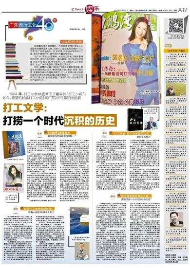 上世纪80年代 伴随着改革开放的春风,大批怀着梦想的年轻人从全国各地蜂拥至珠三角,反映打工者生活和思想的“打工文学”在广东应运而生。30多年来,许多业余写作的打工者,用文字感时抒怀,借书写的力量改变命运。 在广州、深圳、东莞等地,大批打工作家以其极富特色的创作,成为广东文坛的一道风景线。他们当中的佼佼者,如王十月、郑小琼、柳冬妩等人,早已跨出打工作家的身份,走出广东并荣获多个国家级文学大奖。 如今,盛慧的长篇小说《闯广东》正在筹拍电视剧;郭金牛的诗歌《纸上还乡》被译成捷克语、德语、英语、荷兰语,受邀参加鹿特丹国际诗歌节;王十月和郑小琼分别担任著名文学杂志《作品》副主编和副社长……从“打工文学”的江湖出发,他们逐渐登入“庙堂”,用一支妙笔书写更广阔的天地。 1 发芽 “《大鹏湾》来稿量大, 能刊发的作品都是百里挑一” 很多年后,当文学爱好者们回忆起上世纪八十年代,他们一定会想起当年的先锋文学热。在这股席卷全国的浪潮下,1984年,打工小伙林坚尝试写下了《深夜,在海边有一个人》,小说发表在《特区文学》第三期,被视作“打工文学”最早的作品之一。 1986年,按捺不住出去闯闯的念头,张伟明从蕉岭县坐上了开往深圳的长途汽车。6年前,他高中毕业被分配到蕉岭县一家国营厂工作,工余时间都在读书写作中度过,《红楼梦》《战争与和平》等经典著作滋养着他的青春。“在家人朋友的反对声中,我放弃了‘铁饭碗’。”在深圳流浪了半个月后,张伟明找到第一份流水线工作,其后,他做过工人、质检员、领班,酸甜苦辣都尝了个遍。 1988年,打工文学刊物《大鹏湾》在深圳创刊,张伟明的短篇小说《我们INT》在创刊号上发表,随后又刊发于《青年作家》。lNT是港资厂的检验用语,即“接触不良”的意思。这篇小说让张伟明在文学圈迅速走红,他也由一名普通投稿者成了《大鹏湾》的编辑,最后靠这支笔当上了杂志主编。“《大鹏湾》来稿量很大,能刊发的作品都是百里挑一。当时我们的定位很朴实:‘写打工仔,打工仔写’,但选稿很严谨,绝不会降低文字标准。我当执行主编时,甚至要求招聘进来的编辑、记者都应该有过打工经历。”张伟明告诉记者。 在距离深圳不远的顺德,爱好文学的四川小伙周崇贤在一家工厂打工。在集体宿舍的床上、工厂的草地上,他写下了一篇篇小说,然后投给杂志社。1991年6月,周崇贤在《佛山文艺》发表了中篇小说《打工妹咏叹调》,小说多年后被评论家称作“打工文学”代表作之一,他才意识到,当年自己写的小说代表着一种“打工精神”。周崇贤的长篇小说《我流浪,因为我悲伤》《盲流部落》《南国迷情》等等,在打工者中被广泛传阅,主流文学刊物如《作品与争鸣》《小说选刊》《人民文学》曾多次发表他的作品。2003年,周崇贤成为第一位被中国作协吸收的打工文学作家。 “我被安排在流水线上当插件工。这是一条没完没了的流水线,工作时间一天12小时很正常……”1991年,安子的纪实作品《青春驿站——深圳打工妹写真》在《深圳特区报》连载,她记录了包括自己在内的16位打工女性的故事,文字中表现出的积极生活态度激励了万千读者。连载没多久,读者来信似雪花般飞来。1992年,《青春驿站》出版,安子成了明星式的人物。几年后,她在深圳创办家政公司,被誉为中国的“打工皇后”。2000年,中央电视台拍摄改革开放专题片《20年·20人》,称安子是“深圳最著名的打工妹,都市寻梦人的知音和代言人”。 安子、周崇贤、张伟明、林坚、黎志扬,并称打工文学的“五个火枪手”,红极一时。1994年,林坚、张伟明、周崇贤同时获得广东省第九届新人新作奖,“打工文学”由此在广东生根发芽。 2 盛况 “ 很多打工者的出租屋里, 都有一沓沓的《佛山文艺》” “你只要随便走进一间工人宿舍,肯定能发现《大鹏湾》或者《佛山文艺》这类杂志。大家广泛传阅,还会热烈讨论。”回忆起上世纪90年代的工厂生活,一位曾在东莞打工的作者记忆犹新。 “今天大家很难想象当时《大鹏湾》有多受欢迎,仅在珠三角的发行量就有十几万份。如果有打工者向杂志社反映老板拖欠工资,我们只要打电话向老板了解情况,老板第二天就会马上把拖欠的工资发了。作为国内首家打工刊物,《大鹏湾》在当时深入人心。”时任《大鹏湾》主编张伟明说。 “在鼎盛时期,《佛山文艺》单期发行量超过60万份,成为现象级期刊。当时,一个小小的书摊一期能销售六七百本,很多打工者的出租屋里都有一沓沓的《佛山文艺》。直到今天还有很多人告诉我,每期去书摊买《佛山文艺》成了青春岁月的一种仪式。虽然生活贫困、身份卑微,但他们内心有改变自己命运的信念。”曾任《佛山文艺》编辑的盛慧告诉记者,“打工者也需要情感慰藉,而打工文学写的是他们的共同生活,一定程度上为他们缓解了漂泊打拼的精神创伤——这或许就是打工文学不可取代的意义。” 担任《打工族》杂志副主编后,盛慧和打工者们接触更多了,他经常到工厂和工人们面对面交流。《打工者》的定位是“我手写我心”,杂志社每天都能收到几百封投稿,来稿作者多是一线打工者,买不起稿纸,稿子就写在工单后面,内容也多是作者的经历——漂泊的无依、思乡的愁绪、爱情的酸甜……“这些稿件可能缺乏艺术