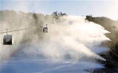 韩国洪川的江原道滑雪场正在为开放滑雪场做准备,实施人工造雪保证滑道畅通。 |