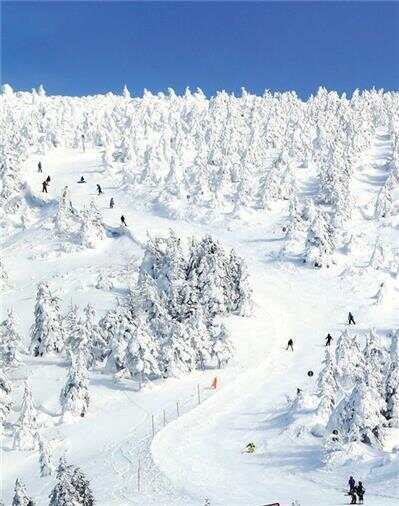 日本山形县的一个藏王温泉滑雪场,当树木被冰雪覆盖形成巨大雾凇,这里便会出现一种壮观的“雪怪成群”的美景。 |