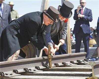 10日,在美国犹他州普罗蒙特里峰,嘉宾在庆祝仪式上“打入最后一根道钉”,重现铁路合龙情景 新华社发 |