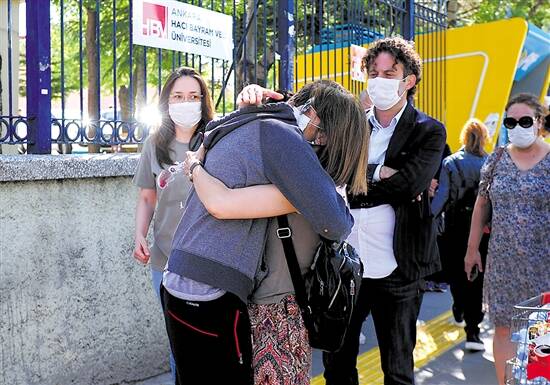 6月27日,一名学生进入土耳其安卡拉的一处考场前和家人拥抱。 当日,大约240万土耳其学生参加了高考。为了防止人群聚集增加新冠病毒感染风险,土耳其在当天实施了几个小时的“禁足令” 新华社发