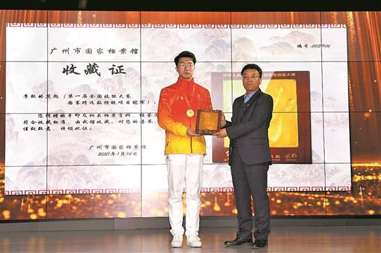 文/图 羊城晚报记者 周聪 实习生 周嘉兴 通讯员 粤仁宣 “没想到我的手印也能被档案馆收藏,感觉非常荣幸!”第一届全国技能大赛冠军分享会暨“国手印记”收藏仪式活动,14日在广州市国家档案馆举行。第一届全国技能大赛97位冠军的金手印,现场正式移交广州市国家档案馆作永久收藏,留给广州一份特殊城市印记。 上月,第一届全国技能大赛在广州举行,大赛86个项目共产生了97位冠军,其中,广东代表团斩获了32个项目的金牌,奖牌数和团体总分均列第一。 为了表达对技能人才的尊重和礼遇,进一步传递技能成才、技能报国的理念,广东省人力资源和社会保障厅联合中共广州市委宣传部(广州市人民政府新闻办公室)共同主办“国手印记”活动,97位冠军选手于大赛闭幕式当晚在特制印泥上按下自己的手印,记录高光一刻。日前,这批象征着用技能成就梦想、用双手创造未来的“技能国手”金手印全部制作完成。 广州市国家档案馆副馆长田炳珍表示:“此次档案馆收入的国手手印均属国家所有,我们将对其进行永久保管。同时与手印一同收入的还有选手们的个人资料简介等。未来,我们将以适当的方式对国手手印进行陈列展示,让更多的市民能够前来参观了解金牌冠军们的成长历史。” 受疫情影响,此次活动邀请了10位冠军选手作为代表进行金手印移交。在收藏仪式上,冠军选手依次携个人金手印登台展示,并从广州市国家档案馆有关负责人的手中接过收藏证书。