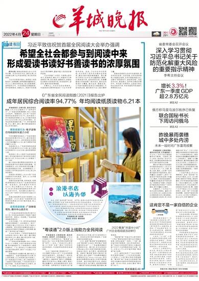 羊城晚报讯 记者孙磊、通讯员南豆报道:4月23日正值第27个“世界读书日”,《广东省全民阅读指数(2021)》报告正式发布。根据报告,2021年广东成年居民综合阅读率为94.77%,成年居民人年