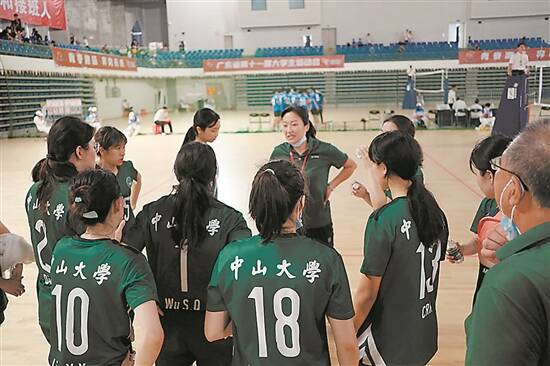 中山大学女子排球队(甲组)教练在比赛中布置战术 |