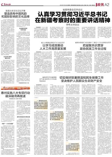 羊城晚报讯 7月24日,省委常委会召开会议,认真学习贯彻习近平总书记在新疆考察时的重要讲话精神,研究广东省落实意见。省委书记李希主持会议。 会议强调,习近平总书记在新疆考察时看望慰