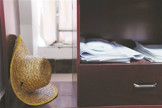 李鼎新的办公桌下放着一顶草帽,他生前常常戴着它下乡走访群众 |