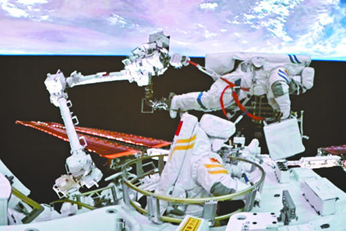 9月1日在北京航天飞行控制中心拍摄的航天员陈冬(上)、刘洋(下)开展舱外操作的画面 新华社发 |