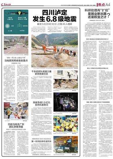 9月5日12时52分,四川甘孜州泸定县(北纬29.59度,东经102.08度)发生6.8级地震,震源深度16公里。截至5日20时30分,地震已造成46人死亡(其中甘孜州29人、雅安市17