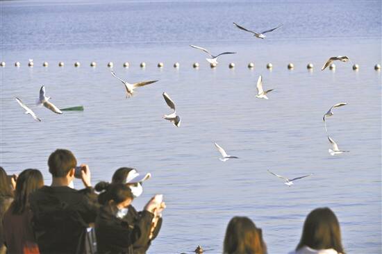 近日,不少越冬候鸟在深圳湾觅食、嬉戏,吸引众多市民游客前来观鸟 新华社发 |