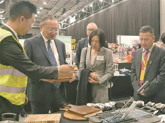 新西兰-广东商品博览会上,中国驻奥克兰总领事陈世杰了解参展产品 |