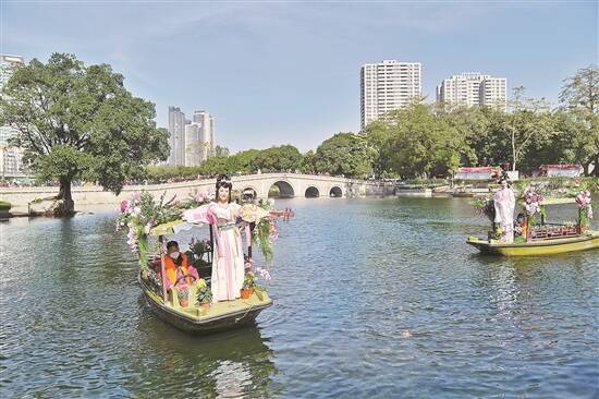 以“荔枝湾”“泮塘古村”“西关小姐”“十三行”等文化旅游名片命名的特色花舫在荔湾湖湖面巡游,述说着岭南文化的温情与厚度 |