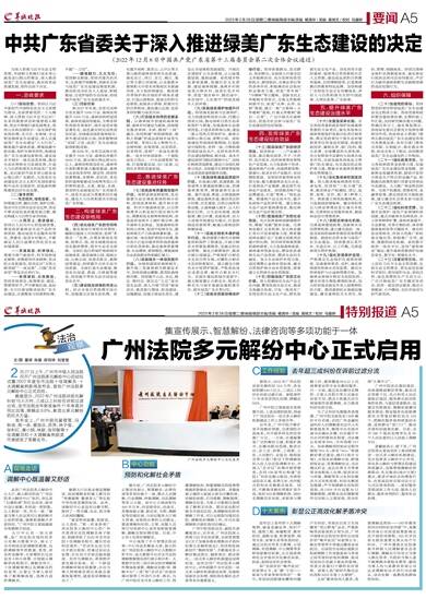 文/图 董柳 张豪 郑育婷 刘莹莹 2月27日上午,广州市中级人民法院召开广州法院多元解纷中心启动仪式暨2022年度全市法院十佳调解员·十大调解案例新闻发布会,宣告广州法院多元解纷中心正式启用。 数据显示,2022年广州法院诉前化解纠纷15.5万件,三成以上纠纷在诉前过滤分流,全市法院去年新收案件11年来首次同比回落,降幅达9.6%,彰显出多元解纷的巨大力量。 发布会上,广州中院向翟筱雪、冯秋培、周一余、黄丽芬、苏萍、林子俊、张利红、康小鸫、林歆、张邓敏等十佳调解员和十大调解案例获奖代表颁发了荣誉证书。 现场走访 调解中心既温馨又舒适 走进广州法院多元解纷中心大厅,映入眼帘的是“广州法院多元解纷中心”标识,旁边是“启德和谐”的红色印章;接待台设计新颖,外形如一把钥匙,让人眼前一亮、耳目一新。“寓意当事人在这里可以拿到解开心结的钥匙,能够和谐解开矛盾纠纷。”广州中院立案庭副庭长张朝晖介绍说。 大厅中心有一块大屏幕,是广州法院在线纠纷多元化解大数据平台,展示了全市两级法院调解的数据,包括调解案件的数量、类型、涉及的金额等;大屏幕的右边还设有4块小屏幕,分别展示调解的流程指引、调解宣传片、十佳调解案例以及调解员的信息等,以便让当事人更好地了解调解流程,选择合适的调解员。 顺着大厅往前走便是调解室,每间调解室的墙上都写有“厚德载物 雅量容人”等弘扬中华传统美德的标语。此外,该解纷中心还设有启德书吧,陈列了一些书籍、杂志,供当事人休闲时翻阅。 “感觉特别温馨,很舒适,让人放松。”第一次来参观广州法院多元解纷中心的广州市荔湾区法院调解员林子俊说,他刚荣获了2022年全市法院十佳调解员称号,擅长劳动纠纷案件。“劳动争议双方往往矛盾比较深,若通过诉讼去处理,往往双方矛盾会越来越深。但作为调解员,希望把矛盾化解在前面。有一个舒适的调解环境也很重要,往往当事人把情绪宣泄出来就会逐渐恢复理性,就更容易调解成功了。” 中心功能 预防和化解社会矛盾 据介绍,广州法院多元解纷中心集宣传展示、智慧解纷、法律咨询等多项功能于一体,整合人民调解、行业调解、仲裁调解、司法调解等多元力量。该中心占地面积约450平方米,内设接待区、洽谈区、多媒体展示墙、联动室、书吧、调解室等功能区域,与诉讼服务大厅相互贯通,来现场办事的人民群众,愿意调解纠纷的,立案、诉服人员将引导其到中心来咨询和接受调解,顺畅实现诉调对接。目前,中心有5名常驻调解员。 中心体现了不少智慧法院成果:中心内设多媒体大屏,展示的是广州法院多元解纷中心大数据分析平台,该大数据平台对全市法院调解数据情况进行展示和分析。大数据平台用三块分屏实时对调解案件整体收案数、调解成功数/率、调解平台“三进”和“总对总”在线诉调对接等工作进行分析、排名,为广州中院对全市多元解纷工作、特邀调解组织、特邀调解员的统筹管理提供智能化大数据支持。多媒体展示墙的4面展示屏为可触控屏,有解纷流程、引导视频、调解案例、调解员信息,当事人可根据自身需求了解相关内容。联动室远程对接全市基层法院、各调解组织所有调解工作室,可以远程指导基层法院、调解组织调解工作,亦可在线调解和开展在线司法确认。 广州中院党组成员、副院长姜耀庭表示,近年来,广州法院深入贯彻习近平法治思想,全面贯彻落实《关于加强诉源治理推动矛盾纠纷源头化解的意见》,坚持和发展新时代“枫桥经验”,不断强化多元解纷集成效应、辐射效应、联动效应,一站式多元解纷机制建设成效初显。此次启用广州法院多元解纷中心,对巩固提升全市法院一站式多元解纷机制建设成果、加强和创新社会治理、预防和化解社会矛盾等具有重要意义。 工作经验 去年超三成纠纷在诉前过滤分流 据统计,2022年广州法院诉前化解纠纷15.5万件,涉及标的额540.7亿元,三成以上纠纷在诉前过滤分流。新收案件11年来首次同比回落,降幅达9.6%。 广州中院立案庭庭长张筱锴介绍,上述成绩的取得,得益于广州法院在一站式多元解纷机制建设工作上多措并举。 近年来,广州中院不断扩容升级解纷资源,完善预防分流体系,并开展多样化的宣传推广方式。一方面,注重凝聚更广泛的解纷力量,积极扩展市、区横向联动范围,推进台办、总工会、侨联、工商联、人社、人民银行、证监会、银保监会等12部门指导下的调解组织入驻人民法院调解平台,并纳入“总对总”诉调对接资源库,会同138家单位构建“法院+”纠纷化解大格局,有效形成信息互通、优势互补、协作配合的纠纷化解联动体系。同时,不断推进解纷资源扩容升级,组织343家调解机构、3865名调解员在诉前、审前参与调解工作,提供覆盖85%以上民商事案由的专业化解纷服务。另一方面,通过诉讼辅导员释明、立案人员指引等方式强化诉前引导,落实9类重点民生领域案件前置调解,全力推进纠纷诉前分流。 为了让纠纷化解服务更便捷,广州中院全面优化ODR解纷平台功能,会同广州金融权益纠纷人民调解委员会引入失联修复技术,精简平台在线申请司法确认步骤,切实提升平台应用的便利化程度,司法确认有效率99%、平均周期13.7天。诉前调解用时较诉讼程序缩短76.5天;深化“5G+”智能解纷模式建设,践行《南沙方案》,实现诉