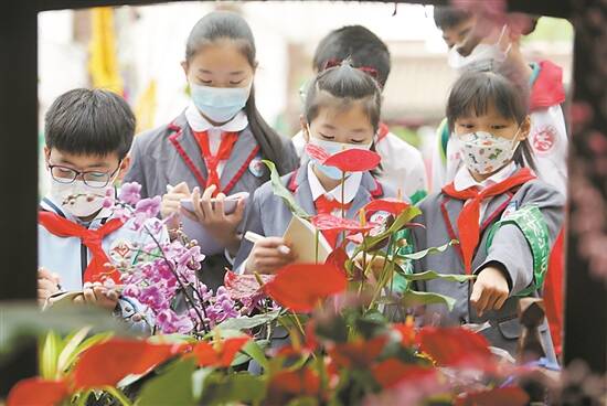 少先队员与青年志愿者们在兰圃开展爱绿护绿实地研学 |