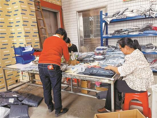 军埔村内某商家工作人员正在打包商品 羊城晚报记者 许悦 摄 |