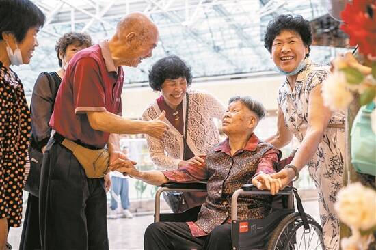 坐在轮椅上的林玉招接受亲戚的祝福 |