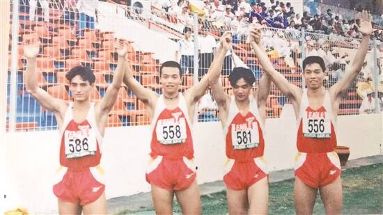 黄淡伟(右一)与队友参加1993年田径亚锦赛 受访者供图 |