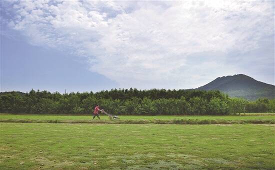 □图/文 唐红生 进入夏季,万物开始繁茂起来。地处茅山革命老区的江苏句容,多为岗坡地,百姓因地制宜种植草坪,逐步走上了小康之路。绿草如茵,在蓝天白云和青山的映衬下,宛如一幅美丽的画。图为种草人正在修剪草坪。 随手拍专用邮箱: ycwbwyb@163.com