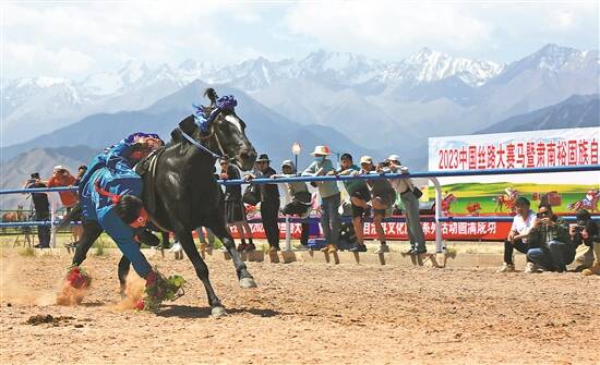 骑手在甘肃肃南裕固族自治县进行马术表演 新华社发 |