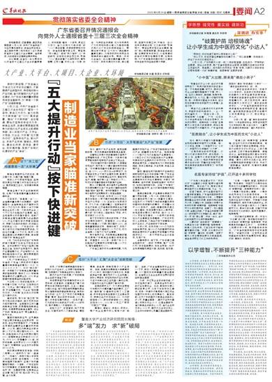 羊城晚报记者 孙晶 陈泽云 许张超 新时代新征程,广东全省上下牢记习近平总书记嘱托,不断提速产业转型升级,持续释放新兴产业动能,奋力助推现代化产业体系建设,为广东经济高质量发展继续